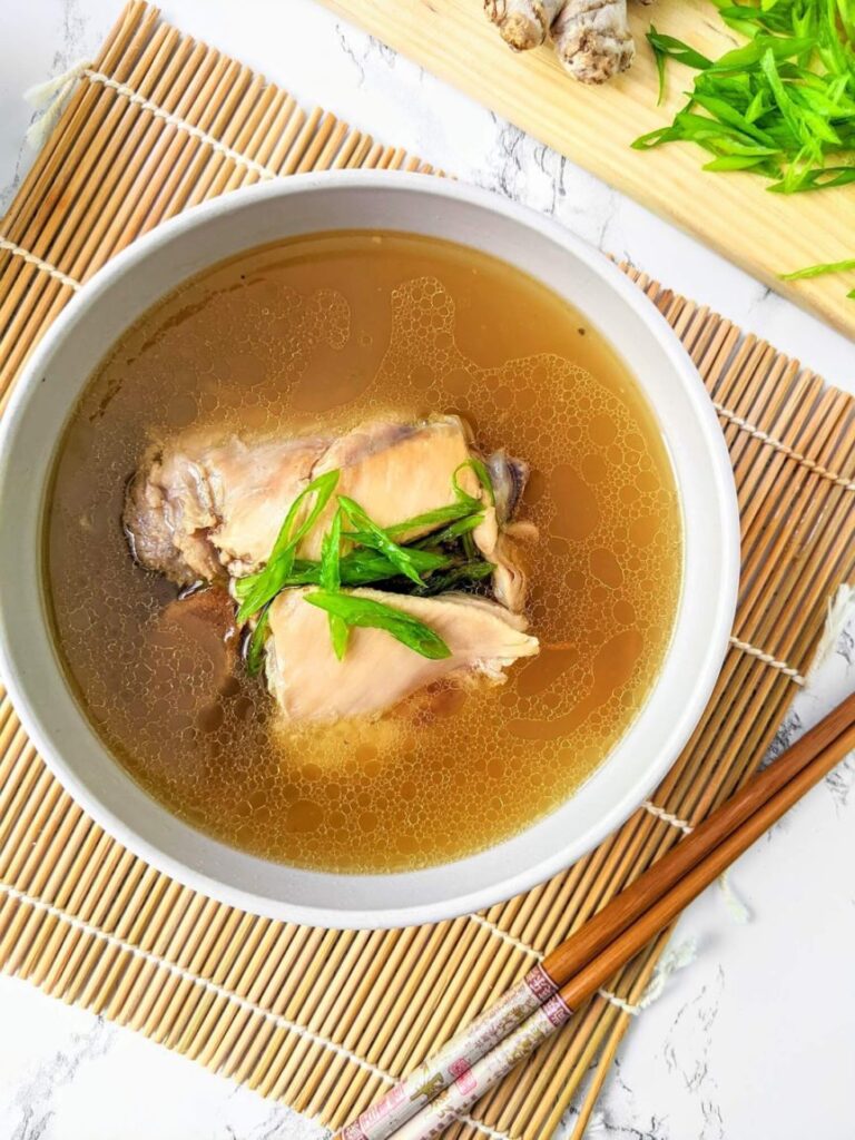 To make this soup, you’ll need chicken pieces, black sesame oil, thick slices of ginger, and rice wine. Some recipes also include dried longyan and mushrooms for added nutrition and flavor.